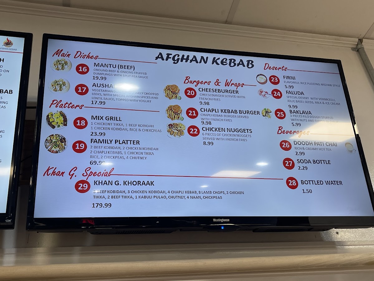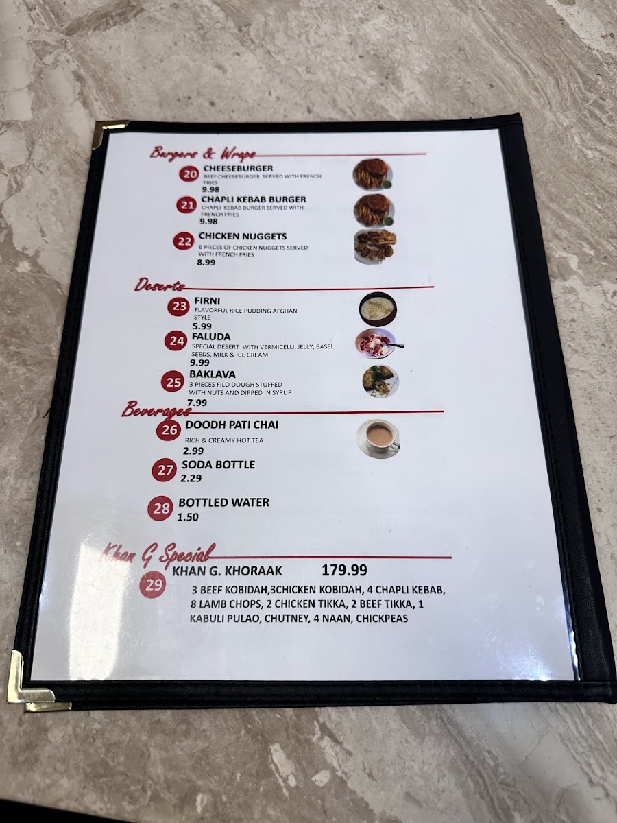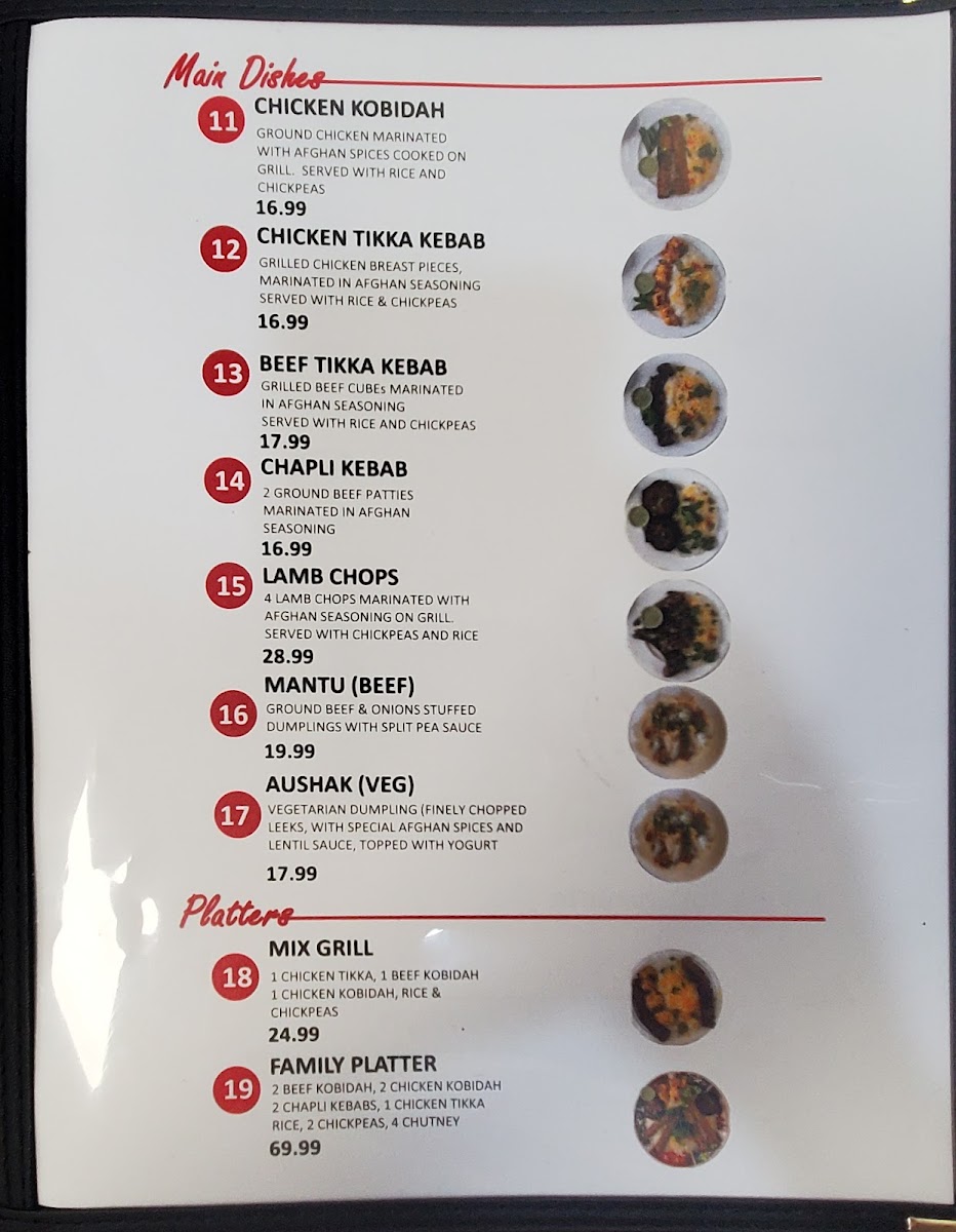 3 BEEF KOBIDAH, 3 CHICKEN KOBIDAH, 4 CHAPLI KEBAB, 8 LAMB CHOPS, 2 CHICKEN TIKKA, 2 BEEF TIKKA, 1 KABULI PULAO, CHUTNEY, 4 NAAN, CHICKPEAS